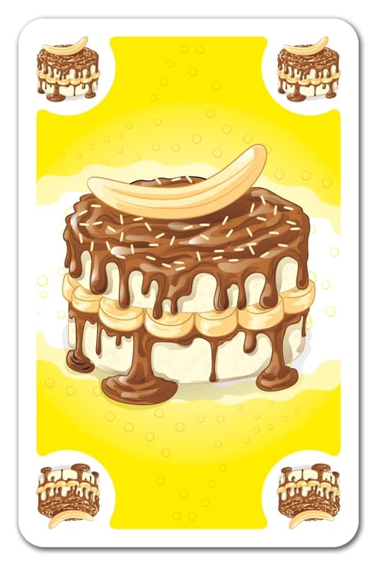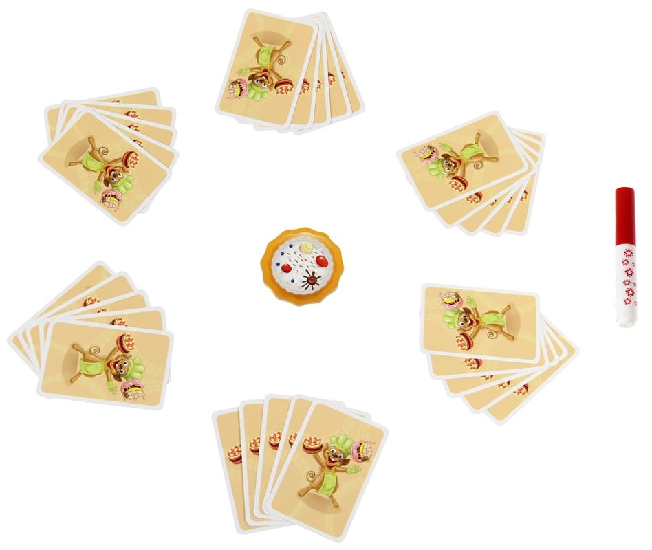 Gracze równocześnie przekazują sobie po jednej karcie z tortem. Osoba, która jako pierwsza zbierze 5 kart w tym samym kolorze, szybko kładzie rękę na płytce z tortem. Pozostali gracze podążają za nią, tworząc w ten sposób stos z dłoni. Gracz, który zareaguje najwolniej, otrzymuje pieczątkę. Wygrywa ten, kto zgromadzi najmniej stempelków. Dynamiczna i apetyczna gra, w której nie obejdzie się bez kleksów! PUDEŁKO ZAWIERA: 30 kart z tortem pisak z pieczątką płytka z tortem instrukcja