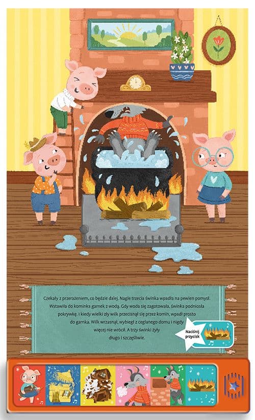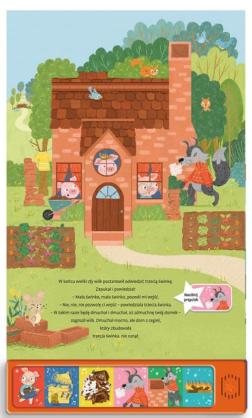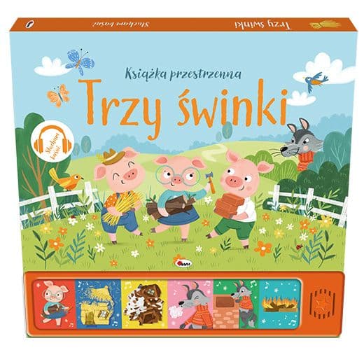 Kartonowa KSIĄŻKA z PANELEM DŹWIĘKOWYM oraz PRZESTRZENNYMI STRONAMI – idealny pomysł na PREZENT.Baśń należąca do KLASYKI LITERATURY DZIECIĘCEJ w adaptacji dostosowanej do najmłodszych czytelników. W środku SYMPATYCZNE ilustracje.Książka zawiera CZYTANY PRZEZ LEKTORKĘ TEKST BAŚNI odtwarzany po naciśnięciu przycisku po każdej rozkładówce.KSIĄŻKA PRZESTRZENNA – po otwarciu ukazują się ROZKŁADANE BAŚNIOWE SCENKI.Książka • wspiera wszechstronny rozwój• przekazuje ważne wartości • pobudza wyobraźnię• kształtuje poczucie estetyki Słucham baśniTo seria baśni należących do KLASYKI LITERATURY DZIECIĘCEJ. Dodatkowym atutem są ROZKŁADANE BAŚNIOWE SCENKI oraz CZYTANY TEKST BAŚNI.Szczegółowe informacje na temat książki Trzy świnki. Słucham baśni