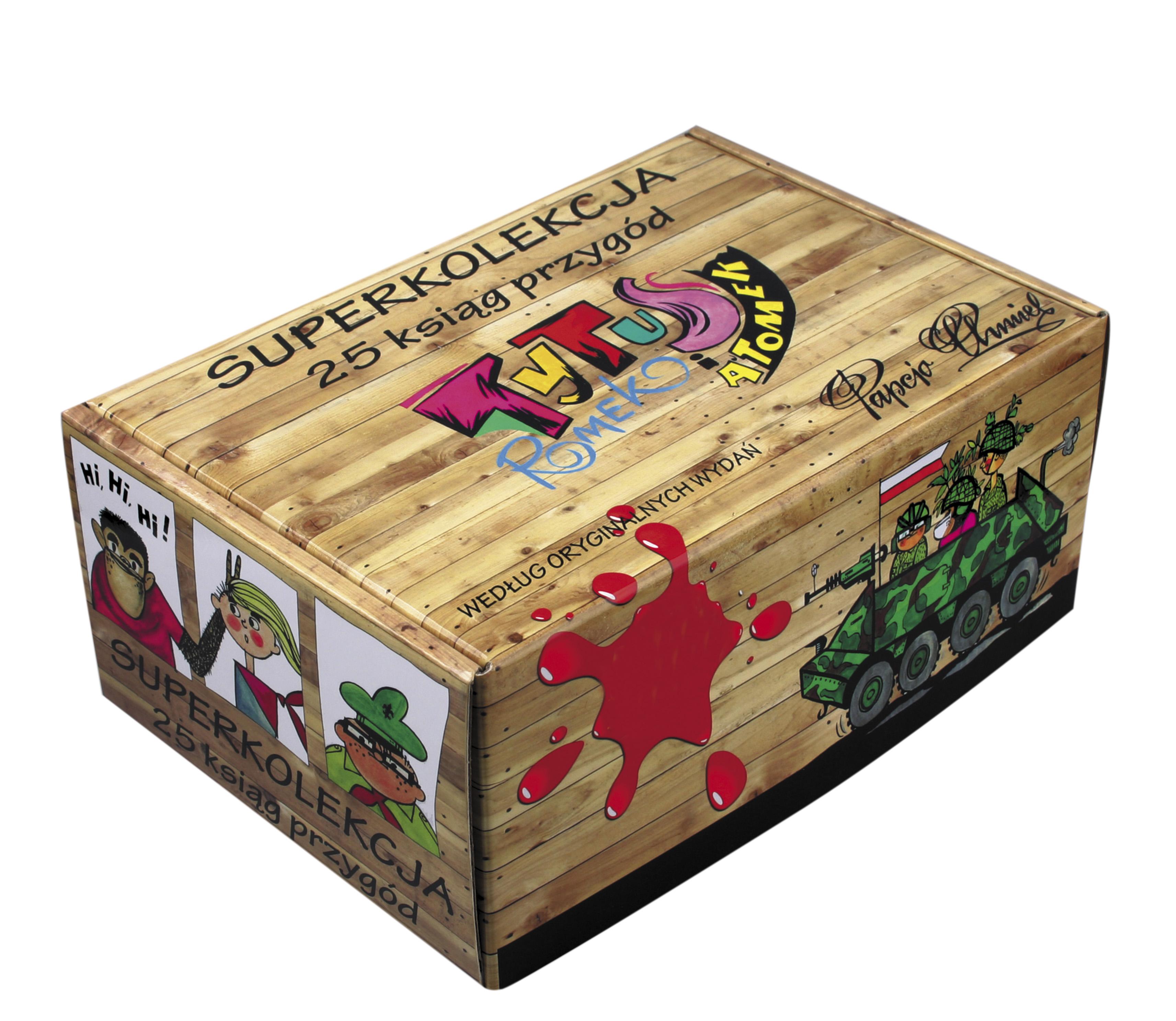Superkolekcja 25 ksiąg z przygodami Tytusa i jego przyjaciół! Komplet 25 oryginalnych wydań komiksów z Tytusem, Romkiem i A’Tomkiem, autorstwa Henryka Jerzego Chmielewskiego, zwanego Papciem Chmielem, zebranych razem w kolekcjonerskim pudełku. Głównym bohaterem niniejszej powieści rysunkowej jest Tytus de Zoo. Tytus oraz dwaj jego przyjaciele - Romek i A`Tomek - znani już wcześniej z gazety harcerskiej "Świat Młodych", gdzie od 1957 roku ukazywały się w odcinkach przygody tej wesołej trójki. Popularność Tytusa i spółki skłoniła autora do przygotowania w 1966 roku w formie książkowej zupełnie nowych przygód tych sympatycznych bohaterów. Przygód, których Tytus zaznał tym razem na harcerskim szlaku. Romek i A`Tomek doszli bowiem do zgodnego wniosku, że Tytus marnuje się i postanowili go wciągnąć do harcerstwa. O tym, co z tego wynikło, przeczytacie za chwilę sami.
