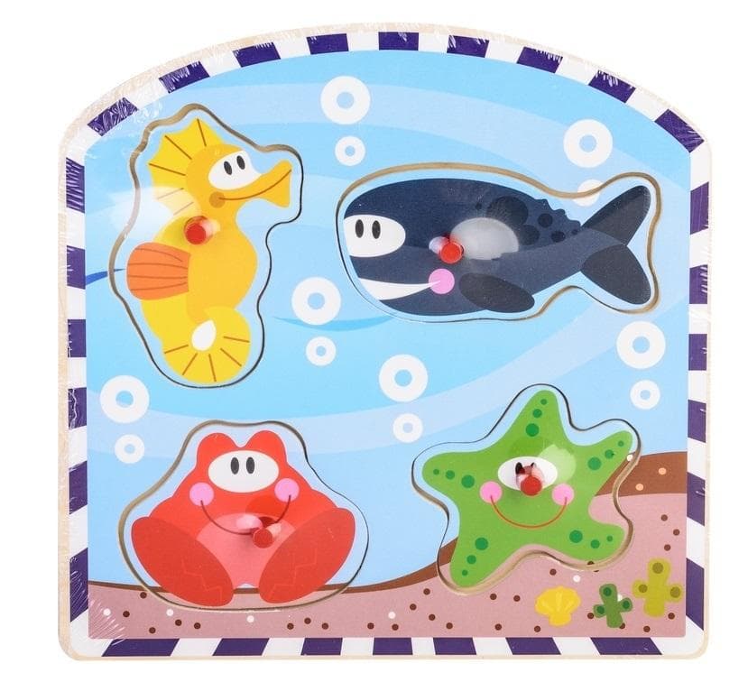 Edukacyjna układanka drewniana dla dzieci przedstawiająca podwodny świat, rozwija spostrzegawczość i koordynację wzrokowo-ruchową. Puzzle z uchwytami uławiającymi ich przenoszenie.