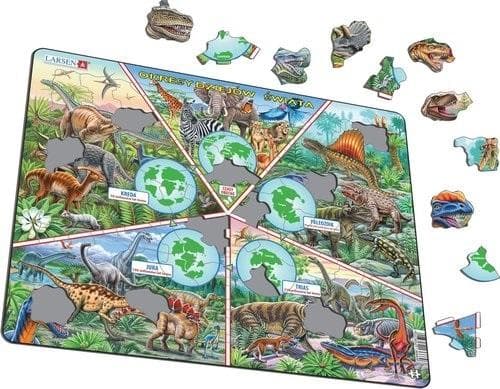 Układanka Maxi (36.5x28.5 cm) z grubej tektury ze specjalnymi kształtami, dzięki którym uczymy się nie tylko cierpliwości ale też języków, matematyki, geografii oraz wiedzy ogólnej. Okresy dziejów świata to układanka stworzona przez norweskiego producenta dla Polski. Jeśli interesujesz się historią Ziemi i gatunków dinozaurów, które żyły w poszczególnych przedziałach czasowych, zajrzyj do tej prostej lecz treściwej układanki podzielonej na 5 okresów Paleozoik, Trias, Jura, Kreda oraz czasy teraźniejsze. Ucz się, układając obrazek ze 100 elementów! Firma Larsen od 75 lat tworzy wysokiej jakości układanki z grubej (4mm) tektury. Naszą ideą zawsze było tworzenie wysokiej jakości produktów dla dzieci, które są zarówno zabawne, jak i edukacyjne. Znajdujemy się w Flekkefjord, idyllicznym miasteczku w południowej Norwegii, w połowie drogi między Kristiansand i Stavanger. Cieszymy się że, dzięki współpracy z fińska firmą Tactic Oy, możemy oferować Państwu najwyższą jakość również w Polsce. Układanki Larsen to całe mnóstwo wzorów dostępnych w różnych stopniach trudności: edukacyjnych (dla dzieci i młodzieży szkolnej), jak i łatwych, kilku- lub kilkunastoelementowych rysunkowych przeznaczonych dla najmłodszych. Unikalny wykrojnik stanowi nie lada wyzwanie i mega frajdę dla układającego to nie są zwykłe puzzle! Układanki Larsen odznaczają się: -nietypowymi i jedynymi w swoim rodzaju wykrojnikami, które sprawiają wielką przyjemność z układania. -produkcją w Norwegii i wysoką jakością. -staranną selekcją obrazków dla każdego wieku -edukacyjnym charakterem układanek -zlokalizowanymi wzorami na wiele rynków.