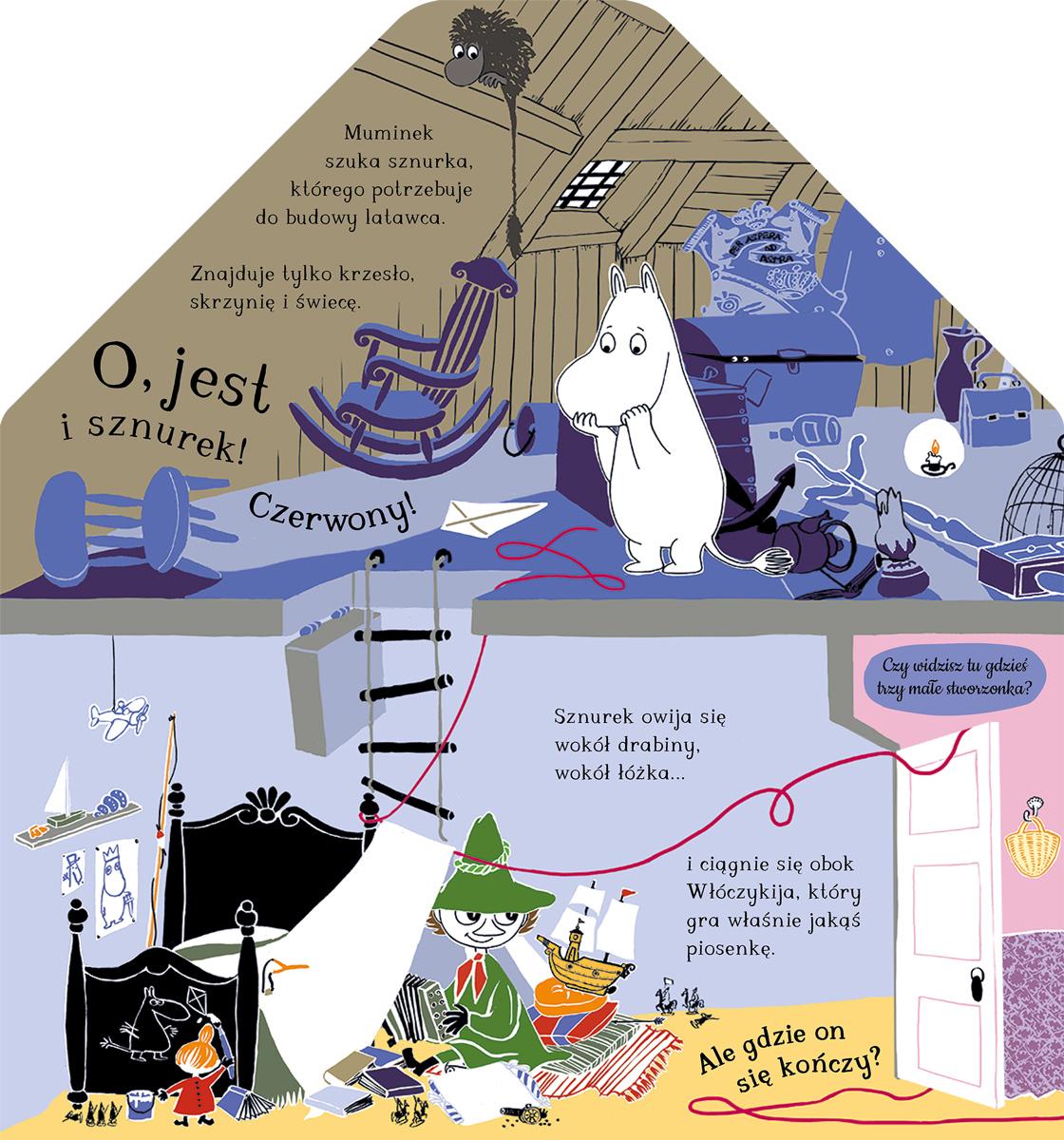 Dołącz do Muminka, który przemierza swój dom w poszukiwaniu czerwonego sznurka. Sznurek jest potrzebny do budowy latawca, a dotarcie po nitce do kłębka nie jest wcale łatwe. Zwiedzaj kolejne zakamarki i odkrywaj urocze sekrety domu Muminków, którego wnętrze przedstawiono w najdrobniejszych szczegółach. Sprawdź, kto w wolnych chwilach buja się na trapezie i kto właśnie zjeżdża po poręczy. Przekonaj się, co Przodek ukrywa w kominku i kto bał się tak bardzo, że wszedł pod poduszkę. Ta niezwykła, pięknie wydana i dopracowana w najdrobniejszych elementach książka pozwoli zajrzeć do wnętrza niezwykłego domu Muminków i poznać codzienne życie jego licznych mieszkańców. Są tu zarówno bohaterowie pierwszoplanowi, jak i mnóstwo małych stworzonek, dla których dom pozostaje zawsze otwarty. W książce znalazło się krótkie, pełne wdzięku opowiadanie, ale to nie jedyna wartość tego tytułu. Są tu także okienka, które można otworzyć, by odkryć kolejne sekrety, i mnóstwo uroczych elementów do wypatrzenia. Książka może być świetną podstawą do zabaw w poszukiwanie obiektów lub do ćwiczenia umiejętności liczenia czy rozpoznawania kolorów. Można ją także wykorzystać jako scenografię do innych zabaw – ustawiona na stole nie przewróci się łatwo, dzięki czemu posłuży jako dziecięcy teatrzyk, a nawet – scena do kręcenia filmików. Książka ma kształt domu, została wykonana z solidnego kartonu. Ma bezpieczne, zaokrąglone rogi tak, by nawet młodsze dzieci mogły bawić się nią bez końca.