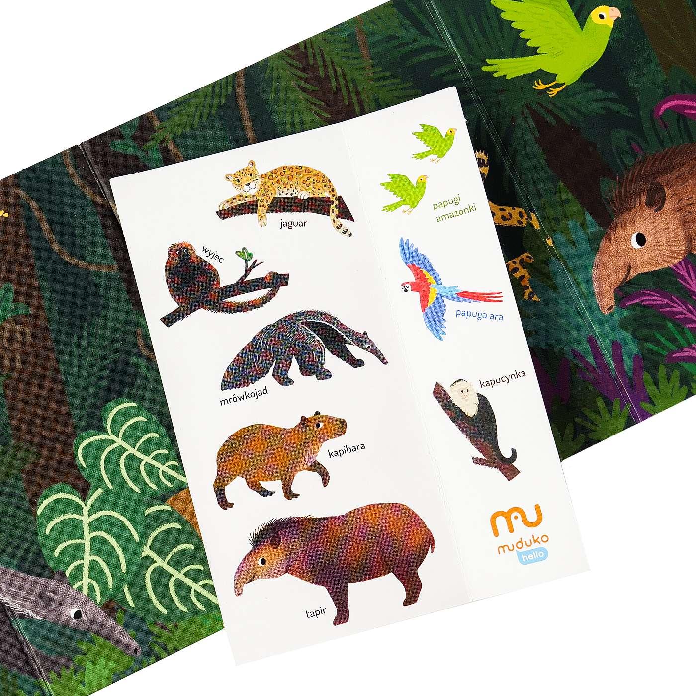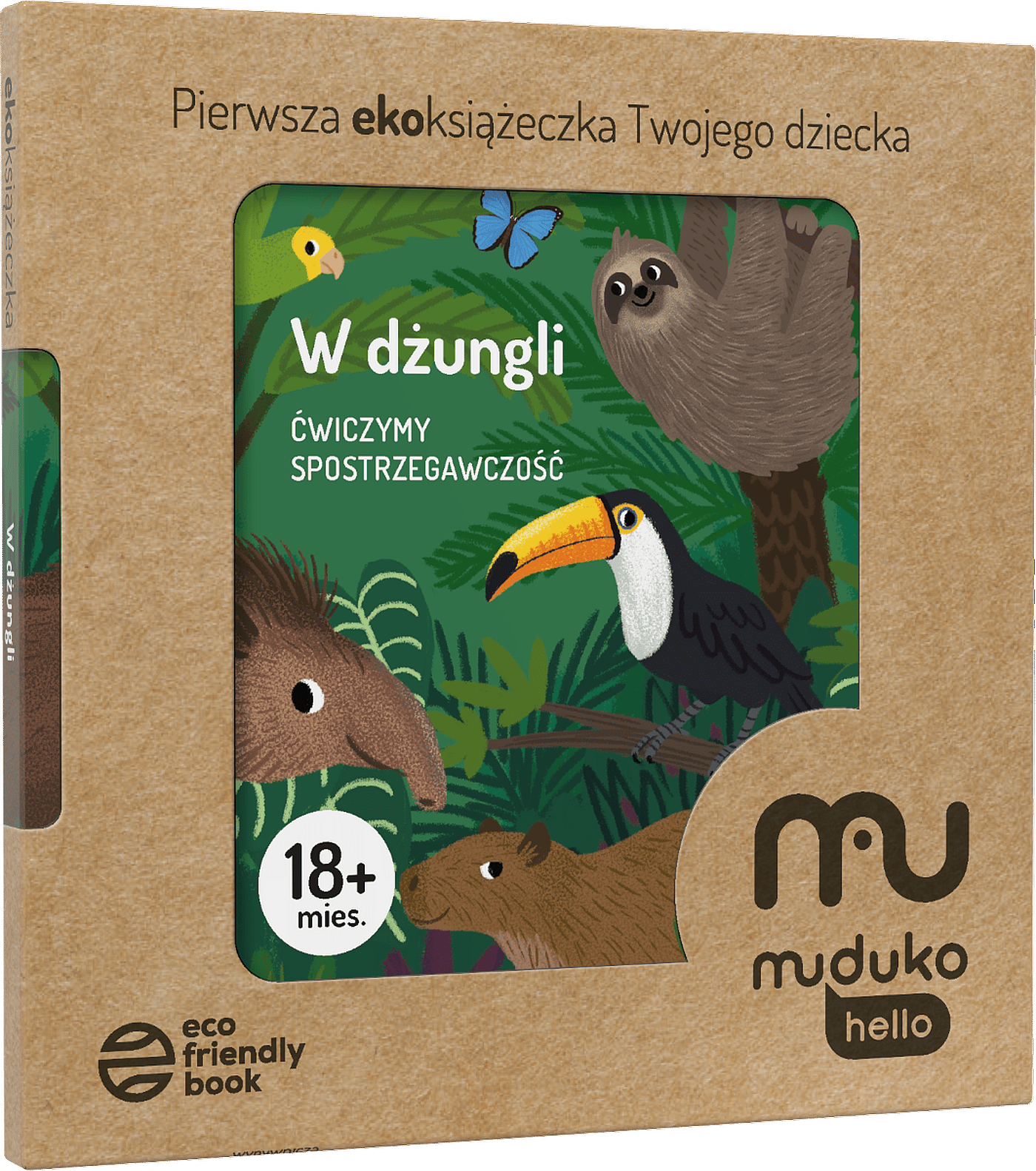 Kolorowa książeczka z tabliczką rozwija spostrzegawczość i koncentrację. Wyjmij składaną tabliczkę, wskazuj na przedstawione na niej zwierzęta i zachęcaj dziecko, by odnalazło je na ilustracjach w książeczce. Polecana przez psychologów dla dzieci od 18 miesiąca życia. Na stronie hello.muduko.com znajdziesz propozycje zabaw i opinię psychologa. Seria wykonana zgodnie z normami certyfikatu ecofriendlygame.com. Dodatkowo seria chroniona powłoką biobójczą Biocidal Coating: wolną od bakterii, wirusów i grzybów.Szczegółowe informacje na temat książki W dżungli. Ćwiczymy spostrzegawczość 18 mies.+ Pierwsza ekoksiążeczka Twojego Dziecka