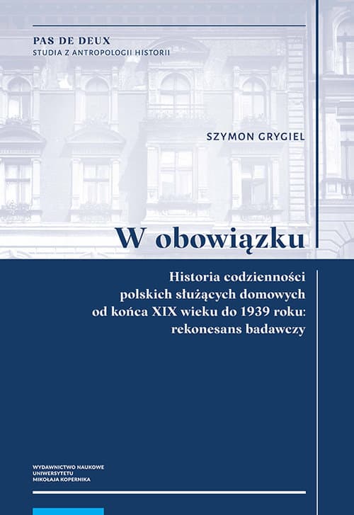 Przed stu laty wspólną częścią losu wielu młodych kobiet pochodzących z ubogich rodzin – głównie wiejskich – było podejmowanie pracy w charakterze służby domowej. Nadmiar rąk do pracy na wsi skłaniał je do opuszczenia rodzinnych domów i pójścia – jak wówczas mawiano – do „obowiązku”. Książka ukazuje wielostronny obraz codzienności polskich służących domowych. Na podstawie analizy różnego typu źródeł – akt sądowych, druków ulotnych, pamiętników, prasy, poradników oraz literatury pięknej – rozważono w niej cztery główne wiązki problemów badawczych: relacje pomiędzy służbą domową a pracodawcami, czas pracy i czas wolny od obowiązków, warunki życia i pracy służących, a także ich perspektywy i trajektorie życiowe. Ze względu na niewielką liczbę źródeł, które wprost dotyczą tej grupy społeczno-zawodowej, informacji na jej temat autor niejednokrotnie poszukuje na marginesach głównego toku rozważań zawartych w tekstach źródłowych, nie wahając się zgłębiać spraw z pozoru błahych. Ponadto stara się zachować równowagę pomiędzy dążeniem do uchwycenia życia służących niejako od wewnątrz (by nie powiedzieć – „od kuchni”), czyli z perspektywy ich przypuszczalnych dążeń, obaw i nadziei, a ukazaniem jego rozmaitych zewnętrznych uwarunkowań.