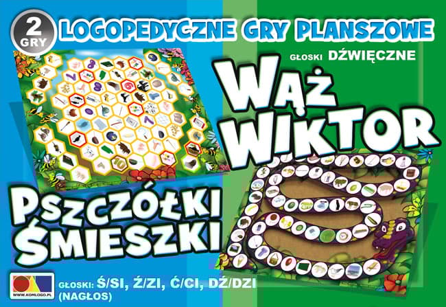 Wąż Wiktor głoski dźwięczne Gra przeznaczona jest do ćwiczeń głosek dźwięcznych. Grać może od 2 do 4 graczy. Rozpoczyna gracz, który wyrzucił 6 oczek. Przesuwa się on do przodu o tyle pól, ile uzyskał w rzucie kostką, dodatkowo nazywając poprawnie obrazki na mijanych polach. Wygrywa osoba, która pierwsza dotrze pionkami do końca lub początku węża Wiktora. Napotkanego na danym polu rywala można „wyrzucić”, wówczas jest on zmuszony do rozpoczęcia gry tym pionkiem od nowa. Zawodnicy mogą wykorzystać w grze od 1 do 4 pionków. Pszczółki Śmieszki – ś/si, ź/zi, ć/ci, dź/dzi (nagłos) Gra przeznaczona jest do ćwiczeń głosek ś/si, ź/zi, ć/ci, dź/dzi (nagłos). Grać może od 2 do 4 graczy. Gra polega na przejściu pionkiem (pionkami) po plastrze miodu. Start następuje z pierwszych czterech pól plastra miodu leżących po przeciwnej stronie wybranego przez gracza „domku” („domki” to cztery wydzielone pola z obramowaniem w kolorze czerwonym, żółtym, niebieskim i zielonym). W grze można wykorzystać od 1 do 4 pionków. Grę rozpoczyna gracz, który wyrzuci kostką 6 oczek. Wówczas ustawia się on na dowolnym polu po przeciwnej stronie (przekątnej) „domku”. Następnie rzucając kostką przesuwa się o liczbę pól, które wskazuje kostka. Przesuwając pionek gracz musi nazwać napotkane po drodze obrazki. W przypadku wyrzucenia 6 oczek, graczowi przysługuje dodatkowy rzut kostką. Jeżeli pionek gracza zatrzyma się na polu, gdzie stoi pionek przeciwnika, następuje jego strącenie do punktu startu. Ruch pionka może odbywać się do przodu, w linii prostej lub po przekątnej. Wygrywa gracz, który pierwszy ustawi swoje pionki w „domku”. Gra dla 2-4 graczy. Wiek 4+