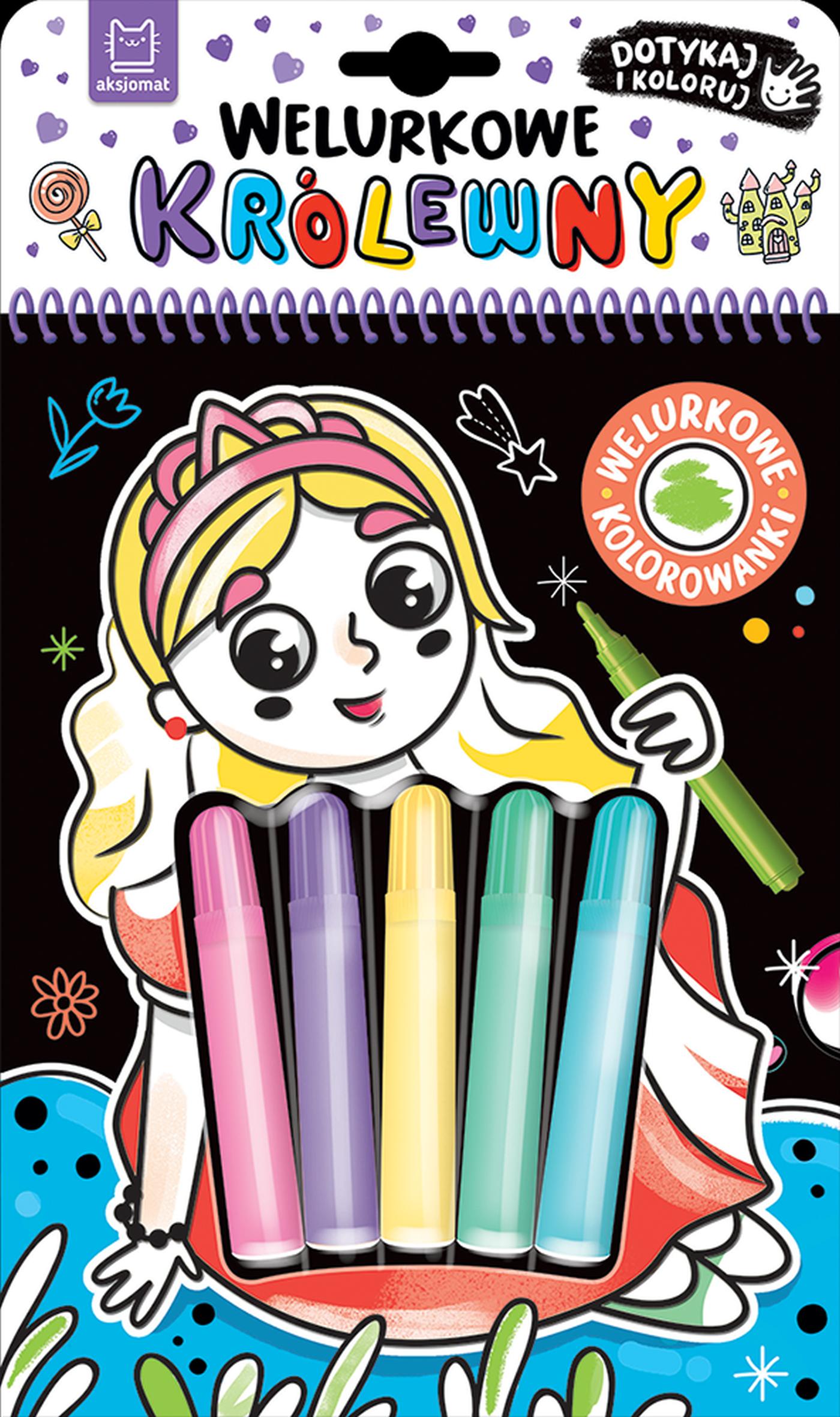 „Welurkowe królewny” to kolorowanka sensoryczna z dołączonymi pisakami. Tło obrazków pokrywa czarny welur, który podkreśla głębię kolorów, zapewnia wrażenia sensoryczne i ogranicza wychodzenie poza linię. Dzięki perforacji pokolorowaną pracę można oderwać, włożyć do ramki i podarować w prezencie lub ozdobić nią pokój. Książeczki z serii „Welurkowe kolorowanki”: