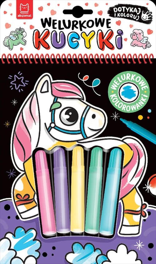 „Welurkowe kucyki” to kolorowanka sensoryczna z dołączonymi pisakami. Tło obrazków pokrywa czarny welur, który podkreśla głębię kolorów, zapewnia wrażenia sensoryczne i ogranicza wychodzenie poza linię. Dzięki perforacji pokolorowaną pracę można oderwać, włożyć do ramki i podarować w prezencie lub ozdobić nią pokój. Książeczki z serii „Welurkowe kolorowanki”: • wspierają rozwój sensoryczny dziecka i naukę pisania, • pomagają ćwiczyć motorykę małą i koordynację ręka - oko, • rozwijają wyobraźnię, uczą staranności i cierpliwości. Dotykaj i koloruj – poznaj świat welurkowych kucyków.