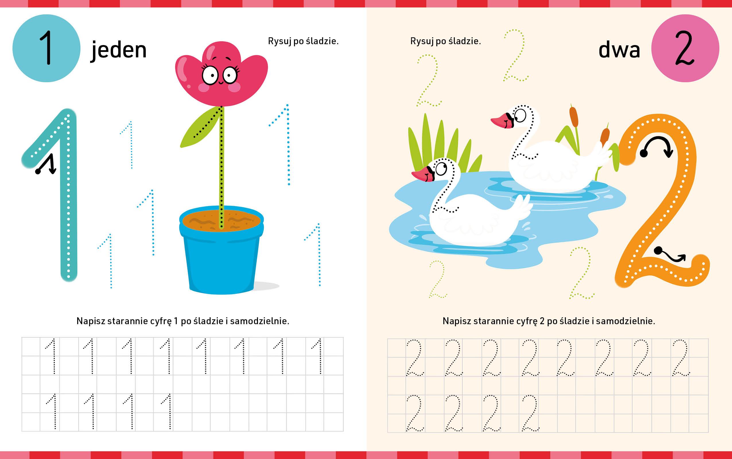 Pisz i poprawiaj – i to wielokrotnie! To przydatne narzędzie w bezstresowej nauce pisania. Kierunek zapisu wskażą strzałki zamieszczone na dużych cyfrach i literach, aby potem łatwiej było ćwiczyć rękę w pisaniu po śladzie w liniach, a specjalny flamaster z gumką i odpowiednio przygotowane strony umożliwią wielokrotne poprawianie, dzięki czemu zadania można wykonywać wiele razy. Dodatkowo maluch może ćwiczyć rysowanie w różnych zygzakach, pętelkach, kołach i innych ciekawych szlaczkach.
