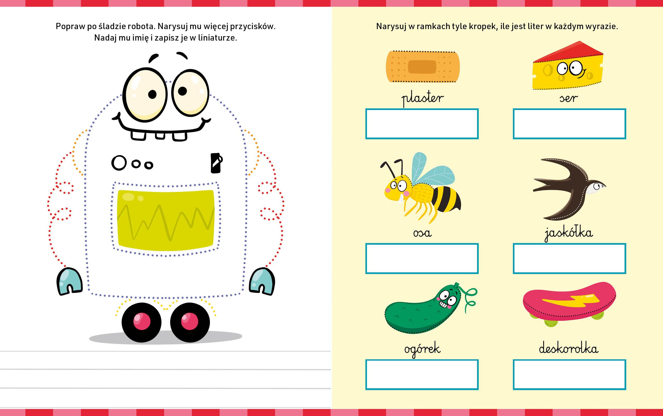 W środku czekają na ciebie różnorodne zadania – ćwicz pisanie, rysowanie i rozwiązuj zagadki, które sprawią, że pierwszy dzień w szkole niczym cię nie zaskoczy. Tu nie ma miejsca na nudę, a dzięki ścieralnemu flamastrowi zadania możesz wykonywać tyle razy, ile chcesz. Baw się dobrze!