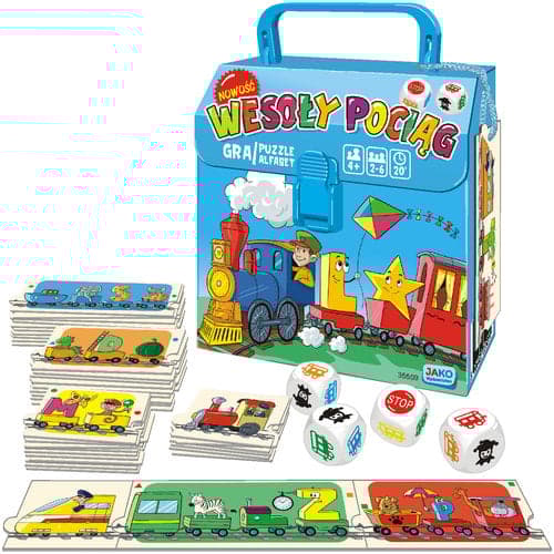 Gra Wesoły pociąg dzięki prostym zasadom jest odpowiednia dla przedszkolaka, wciągnie także dorosłego gracza. To gwarancja udanej zabawy dla wszystkich, bez względu na wiek. Wybierzcie swoje lokomotywy, parowe ciuchcie lub szybkie elektrowozy. Rzucając kostkami, zdobywajcie wesołe wagoniki i budujcie swoje pociągi. Gracz, który będzie mieć najwięcej wagonów (punktów), wygrywa. W wariancie zaawansowanym wykażcie się znajomością alfabetu i zdobywajcie dodatkowe punkty. Zasady gry: Zadaniem graczy jest zbudowanie pociągów z jak największą liczbą wagonów (uzyskanie jak największej liczby punktów). Przygotowanie do gry • Rozłóżcie kartoniki z wagonami, pogrupujcie je według kolorów i długości (tworząc pulę). • Kostki połóżcie obok nich. • Każdy gracz bierze po 1 kartoniku z lokomotywą i kładzie go przed sobą. Jeśli graczy jest mniej niż sześciu, niewykorzystane kartoniki z lokomotywami nie biorą udziału w grze. Rozgrywka Grę rozpoczyna osoba, która ostatnio jechała pociągiem (lub najmłodszy gracz). • Gracz w swojej kolejce bierze kostki i rzuca wszystkimi naraz. Może wykonać maksymalnie 3 takie rzuty. Po każdym rzucie może odłożyć na bok wybrane kostki. Pozostałymi rzuca dalej. Raz odłożone kostki może wykorzystać w kolejnych rzutach. • Celem rzutów jest uzyskanie odpowiedniej wartości na kostkach, zabranie z puli zgodnego co do koloru i liczby wagonów kartonika i dodanie go do swojego pociągu. • Jeśli gracz wyrzuci Stop - nie zdobywa żadnego kartonika - grę kontynuuje kolejna osoba. • Dżoker zastępuje dowolny kolor. • Jeśli wyrzucona wartość nie jest dostępna, gracz może zabrać kartonik w danym kolorze o mniejszej liczbie wagonów. • Jeśli w puli nie będzie już kartoników odpowiadających wartości na kostkach, to gracz nie zdobywa żadnego kartonika - grę kontynuuje kolejna osoba. • Podczas jednej kolejki można zdobyć tylko jeden kartonik (jeśli są dwie pary, gracz wybiera jedną z nich). • Kolejka przebiega zgodnie z kierunkiem ruchu wskazówek zegara. Koniec gry Gra się kończy, gdy w puli nie ma już kartoników. Policzcie wagony w swoich pociągach. Każdy wagon to jeden zdobyty punkt. Wygrywa gracz, który zdobędzie najwięcej punktów. Możliwy jest remis. Wariant zaawansowany Punkty ekstra Jeśli chcecie zwiększyć poziom trudności gry, wprowadźcie dodatkową zasadę: za każde połączenie kartoników, w których literki ułożone są zgodnie z kolejnością, w jakiej występują w alfabecie, zdobywacie dodatkowe punkty. Zawartość opakowania: 30 kartoników z wagonami (2-, 3- i 4-wagonowymi) 6 kartoników z lokomotywami 3 kostki z wagonami i dżokerem 1 kostka z wagonami i stopem Instrukcja