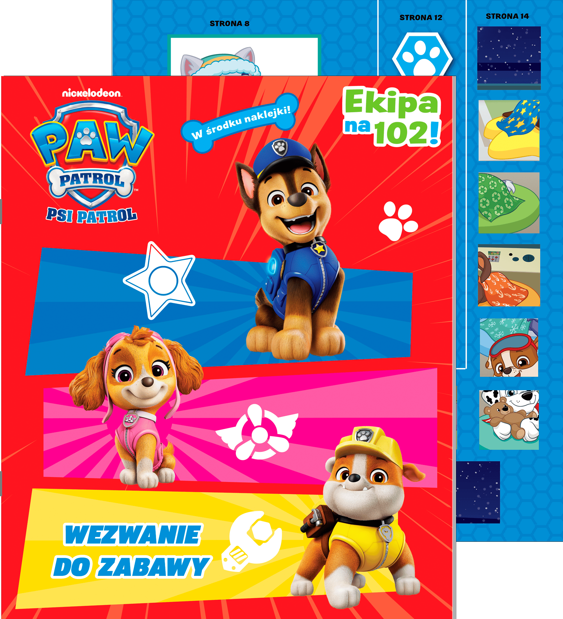 "Psi Patrol. Ekipa na 102!" zawiera zagadki, łamigłówki oraz kolorowanki z ulubionymi bohaterami w roli głównej. W środku również kolorowe naklejki z dzielnymi pieskami! Rezolutne szczenięta Marshall, Rubble, Chase, Rocky, Zuma i Skye oraz dziesięcioletni chłopiec Ryder nigdy nie odmówią pomocy potrzebującym-pomagaj pieskom w ich bohaterskiej misji poprzez rozwiązywanie różnorodnych zadań.