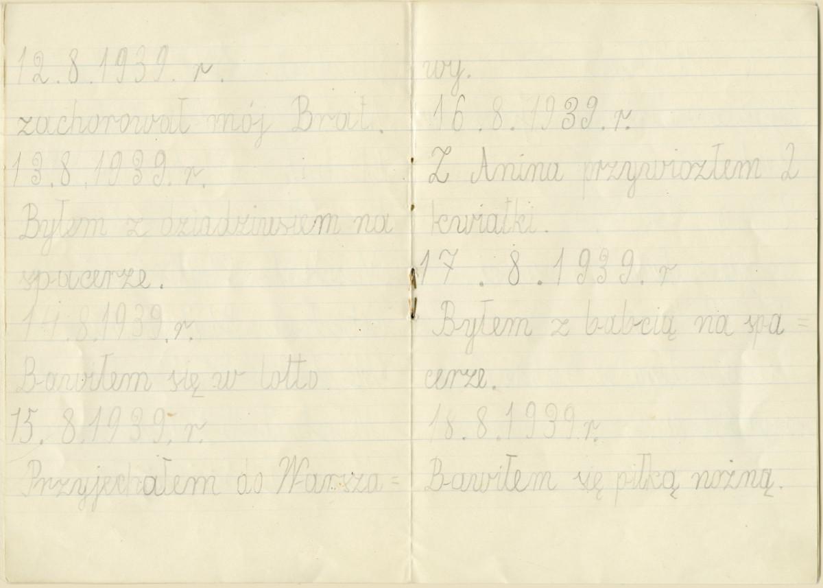 Malarsko zilustrowany autentyczny dziecięcy „dziennik” z wakacji przerwanych wojną Ośmioletni Michał dostał na wakacje zadanie: codziennie zapisywać jedno zdanie w zeszycie. Tak zaczął powstawać wyjątkowy dziecięcy dziennik. Przez dwa miesiące – od połowy lipca do połowy września – każdego dnia chłopiec odnotowywał w najprostszy sposób jedno codzienne zdarzenie. Są tu spacery i rodzinne spotkania, zabawy i obserwacje przyrody. Te wakacje nie były jednak zwyczajne. Był to bowiem rok 1939. Pierwszego września rozpoczęła się wojna… Osiemdziesiąt lat później ten niezwykły dokument – autentyczny dziecięcy „dziennik” z wakacji przerwanych wojną – dopełniony efektownymi, malarskimi ilustracjami stał się jedyną w swoim rodzaju książką.
