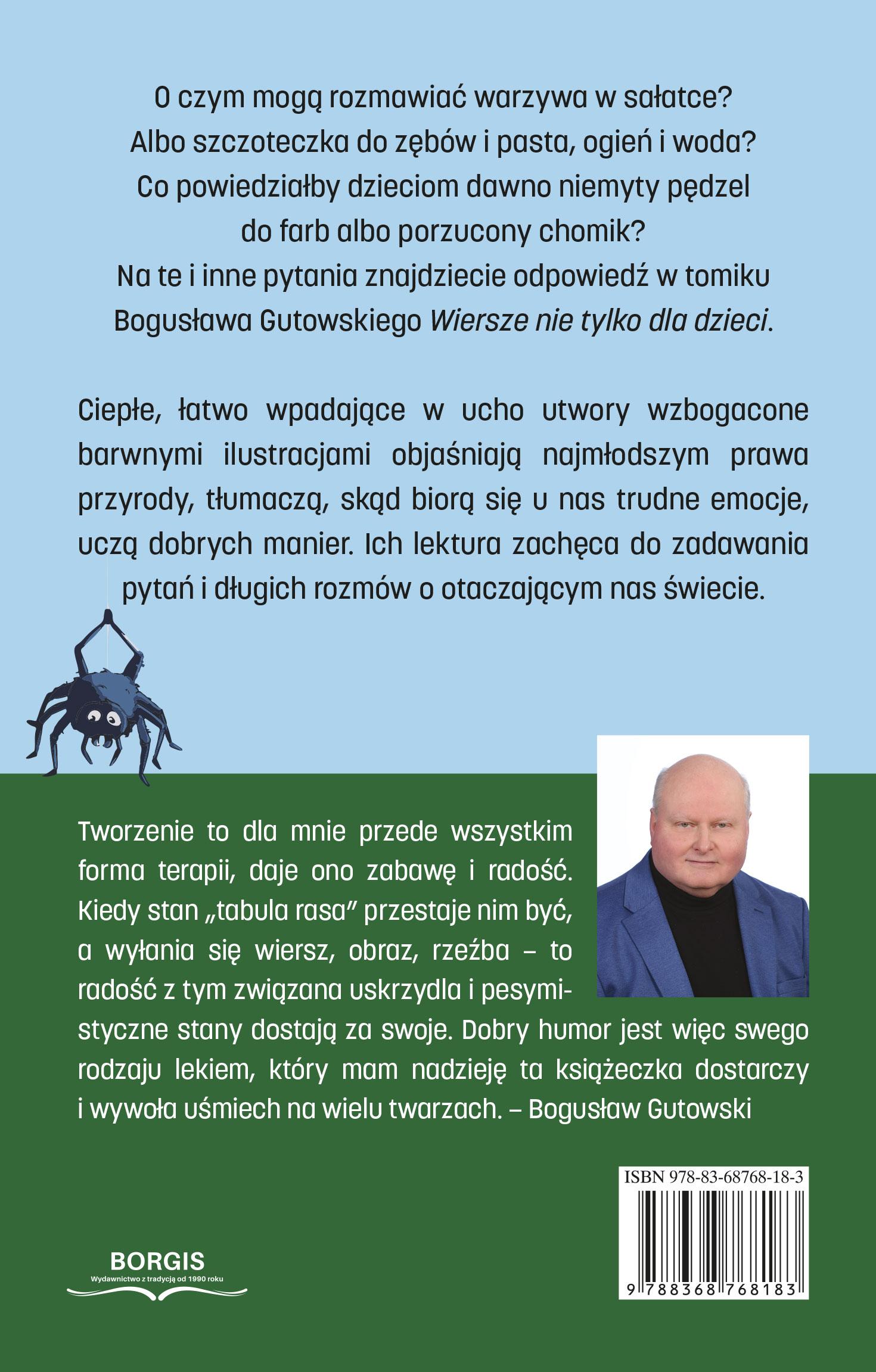 „Wiersze nie tylko dla dzieci” Bogusława Gutowskiego to wyjątkowa lektura. Przyciąga uwagę najmłodszych i wspiera rozwój wyobraźni dziecka. Tomik zawiera wiersze oparte na dialogach, w których codzienne przedmioty, rośliny i zjawiska opowiadają własne historie.