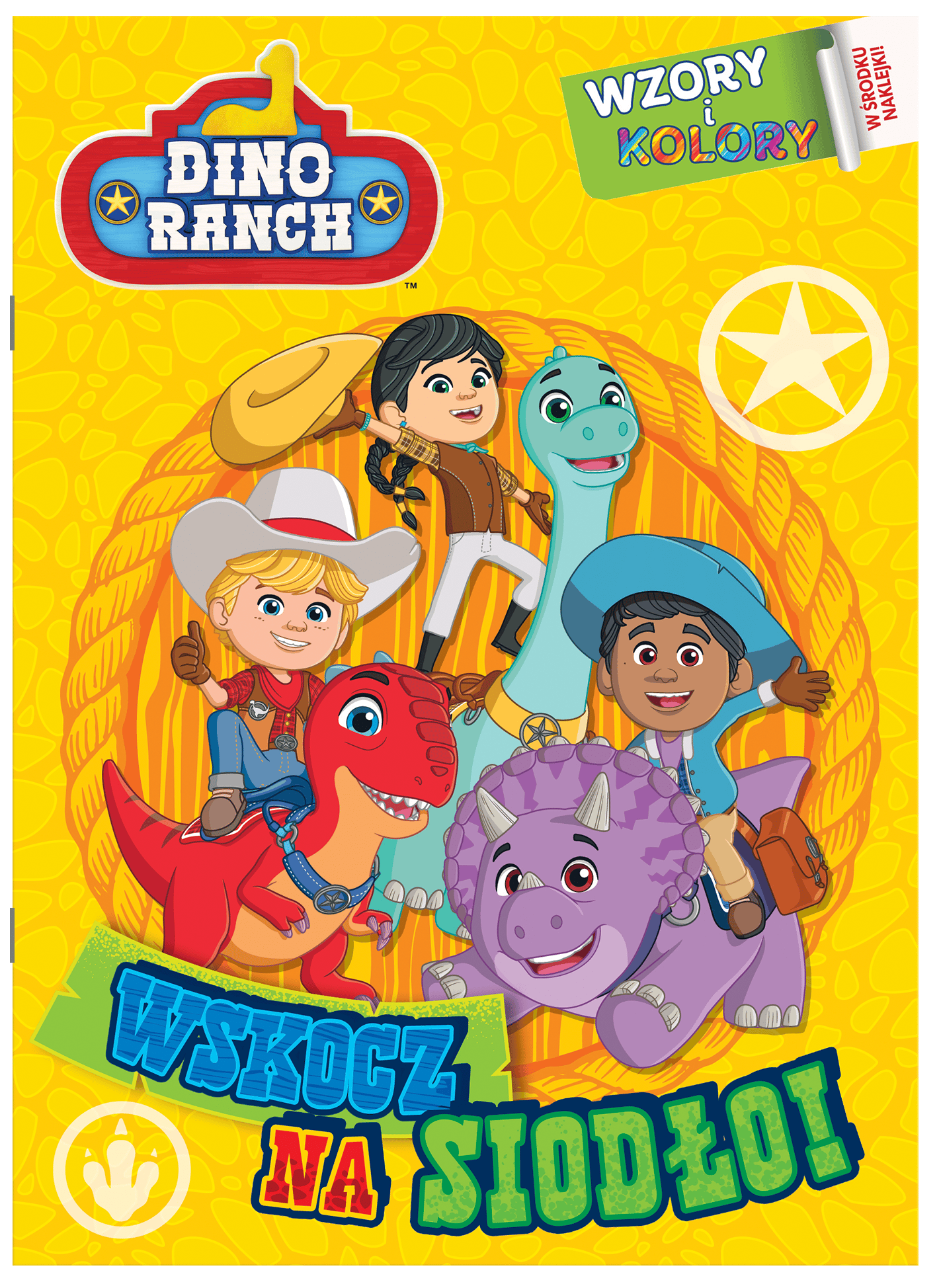W książce Dino Ranch. Wzory i kolory dziecko znajdzie kolorowanki i naklejki. Wystarczy przykleić naklejkę – wzór i pokolorować najpiękniejsze obrazki z Dino Ranch. Świetna zabawa z ulubionymi bohaterami gwarantowana!