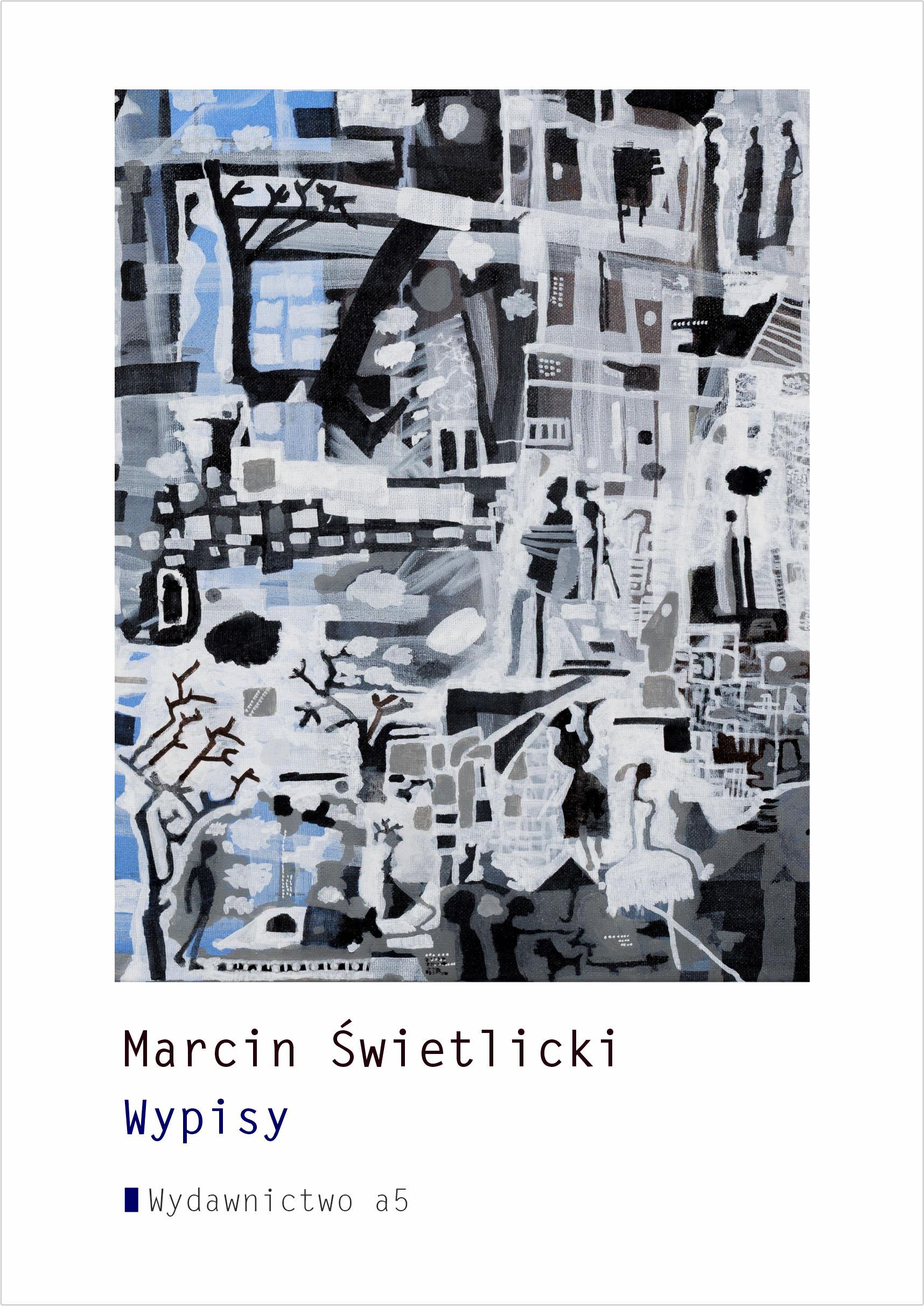 1996, 2006, 2016, 2026 -  raz na dziesięć lat Marcin Świetlicki wydaje książkę w Bibliotece Poetyckiej Wydawnictwa a5. Po „Trzeciej połowie", „Muzyce środka", „Drobnej zmianie" przyszła kolej na „Wypisy”. Za każdym razem są to książki znakomite: demaskują, niepokoją, intrygują. Nie pozostawiają czytelnika obojętnym, przypominając że Marcin Świetlicki jest jednym z najbardziej przenikliwych, ale również czułych obserwatorów rzeczywistości. Tym razem w połowie drogi miedzy wierszem a piosenką, niepowtarzalny rytm poezji Świetlickiego wciąga czytelnika w intymny świat autora.