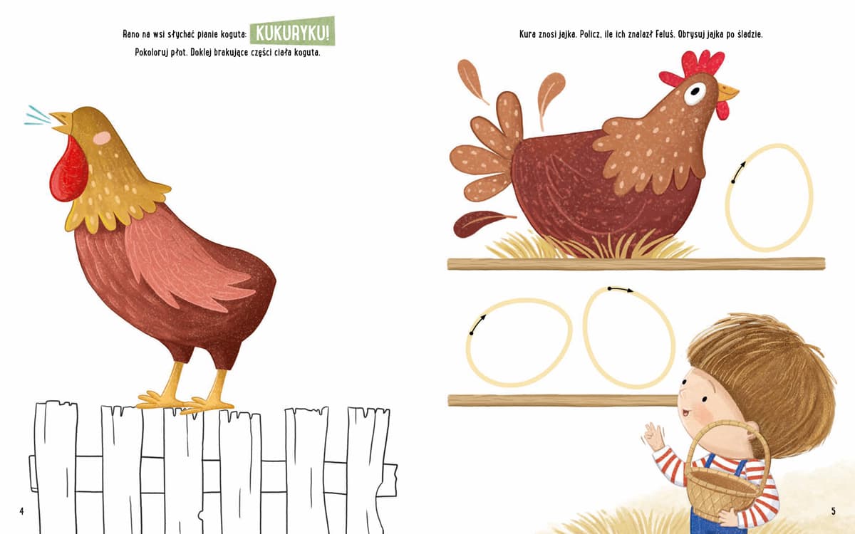 Kreatywny zeszyt dla najmłodszych. Krótka historyjka przedstawiona na początku książeczki stanowi punkt wyjścia do zabaw zawartych na dalszych stronach. Zeszyt zawiera aktywności dotyczące czytania, słuchania, myślenia matematycznego i logicznego oraz ćwiczenia na spostrzegawczość, a przede wszystkim ćwiczenia wspierające pracę rąk (grafomotoryczne), dzięki czemu w naturalny sposób wspiera rozwój dzieci. Tom „Zabawy z Felusiem i Guciem. Wycieczka na wieś” przeznaczony jest dla dzieci w wieku 3–4 lat. Wydanie z naklejkami kolorowymi i do kolorowania! Katarzyna Kozłowska – absolwentka pedagogiki specjalnej Uniwersytetu Adama Mickiewicza oraz edukacji artystycznej Uniwersytetu Artystycznego w Poznaniu. Nauczycielka wychowania przedszkolnego. Autorka bestsellerowej serii „Feluś i Gucio”, w której kładzie nacisk na rozwój emocjonalny dziecka, odwołując się do jego przeżyć i sposobu poznawania świata. Marianna Schoett – ilustratorka książek dla dzieci. Ukończyła Państwowe Liceum Sztuk Plastycznych w Bydgoszczy, a następnie kontynuowała naukę na Wydziale Sztuk Pięknych UMK w Toruniu. Rysowanie to od zawsze jej hobby. Już od pierwszego tomu Feluś i Gucio na stałe wpisali się w jej codzienne życie i wytyczają jego rytm, od pewnego czasu także jako bohaterowie gier i zabawek. Nadawanie kształtów kolorowemu światu Felusia i Gucia to obszar, w którym czuje się kompletnie spełniona! Sukces serii przyjmuje z wielką radością, bo zawsze chciała ilustrować książki. Powyższy opis pochodzi od wydawcy.