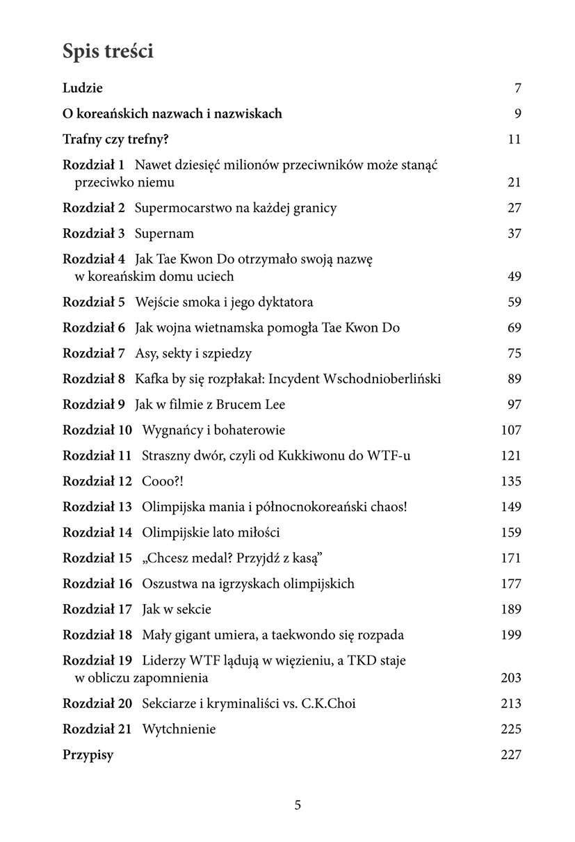 Zabójcza sztuka walki. Nieznana historia Tae Kwon Do zabiera czytelnika w czasy dwóch światowych liderów tej sztuki walki i sportu: Choi Hong Hi i Kim Un Yonga oraz ich następców, pokazując z kronikarską dokładnością ewolucję lokalnej sztuki walki: od bojowej umiejętności na bitewnych polach wojny koreańskiej i wojny wietnamskiej, poprzez narzędzie dyktatury wojskowej i agentów służb specjalnych aż po olimpijski sport o światowym zasięgu. Tae Kwon Do uprawiane w ponad 200 krajach na całym świecie stało się globalną sztuką walki XXI wieku, słynną w świecie sportów walki ze wspaniałych technik walki nogami. To również jeden z dwóch azjatyckich sportów walki, który obok japońskiego judo znalazł stałe miejsce w panteonie sportów olimpijskich. Zabójcza sztuka walki. Nieznana historia Tae Kwon Do jest częściowo biografią, częściowo rozprawą historyczną, a częściowo pamiętnikiem stworzonym z opowieści pionierów kształtujących przez lata tę sztukę walki.