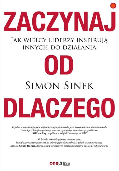 Książka została wyróżniona w kwartalnym przeglądzie najważniejszych książek (lato 2013) opublikowanego przez THINKTANK. Zapraszamy do lektury przeglądu nowości wydawniczych Zrób to inaczej niż inni Każdy człowiek i każda organizacja mogą wyjaśnić, CO robią. Niektórzy z nas potrafią pokazać, CZYM różnią się od innych. Jednak tylko nieliczni są w stanie jasno wyartykułować, DLACZEGO robią to, co robią. DLACZEGO nie ma nic wspólnego z finansami i zyskami. DLACZEGO jest tym, co inspiruje Ciebie i Twoje otoczenie. Otwórz tę książkę i odnajdź samą kwintesencję inspiracji. Przewróć kilka stron i poznaj prosty wzór, sposób myślenia, działania i komunikowania się, dzięki któremu przywódcy są w stanie skutecznie zainspirować swoje otoczenie. Wczytaj się w historie Martina Luthera Kinga juniora czy Steve’a Jobsa i przekonaj się, że wszyscy liderzy, którzy kogokolwiek inspirują, myślą, działają i komunikują się z innymi z pominięciem ogólnodostępnych schematów. Każdy z nas może zdobyć tę umiejętność. Przy odrobinie dyscypliny każdy lider lub organizacja mogą skutecznie oddziaływać na innych. Przeczytaj wszystkie porywające opowieści i naucz się być skutecznym przywódcą. Przyciągnij do siebie ludzi i trwale zmień oblicze biznesu. Poznaj siłę DLACZEGO! Simon Sinek przewodzi ruchowi, którego celem jest inspirowanie ludzi do robienia tego, co ich inspiruje. Współpracuje z RAND Corporation, wykłada komunikację strategiczną na Uniwersytecie Columbia i aktywnie udziela się w świecie sztuki oraz przedsięwzięć non profit. Zapraszali go członkowie Kongresu i ambasadorowie, przedstawiciele drobnego biznesu i wielkie korporacje, takie jak Microsoft czy Wal-Mart, by wyjaśnił, jak inspirować innych, i wyłożył swoją koncepcję DLACZEGO.