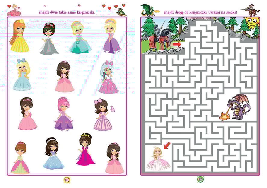 Przeżyj niesamowite przygody w świecie uroczych księżniczek i odważnych rycerzy. Znajdź dwie takie same tiary, dopasuj odpowiedni cień do królewny, pomóż księciu odnaleźć drogę w labiryncie, wyszukaj różnice między bajkowymi obrazkami. Te i wiele innych królewskich zagadek to doskonałe połączenie nauki z zabawą i odrobiną magii.Szczegółowe informacje na temat książki Zagadki dla księżniczek