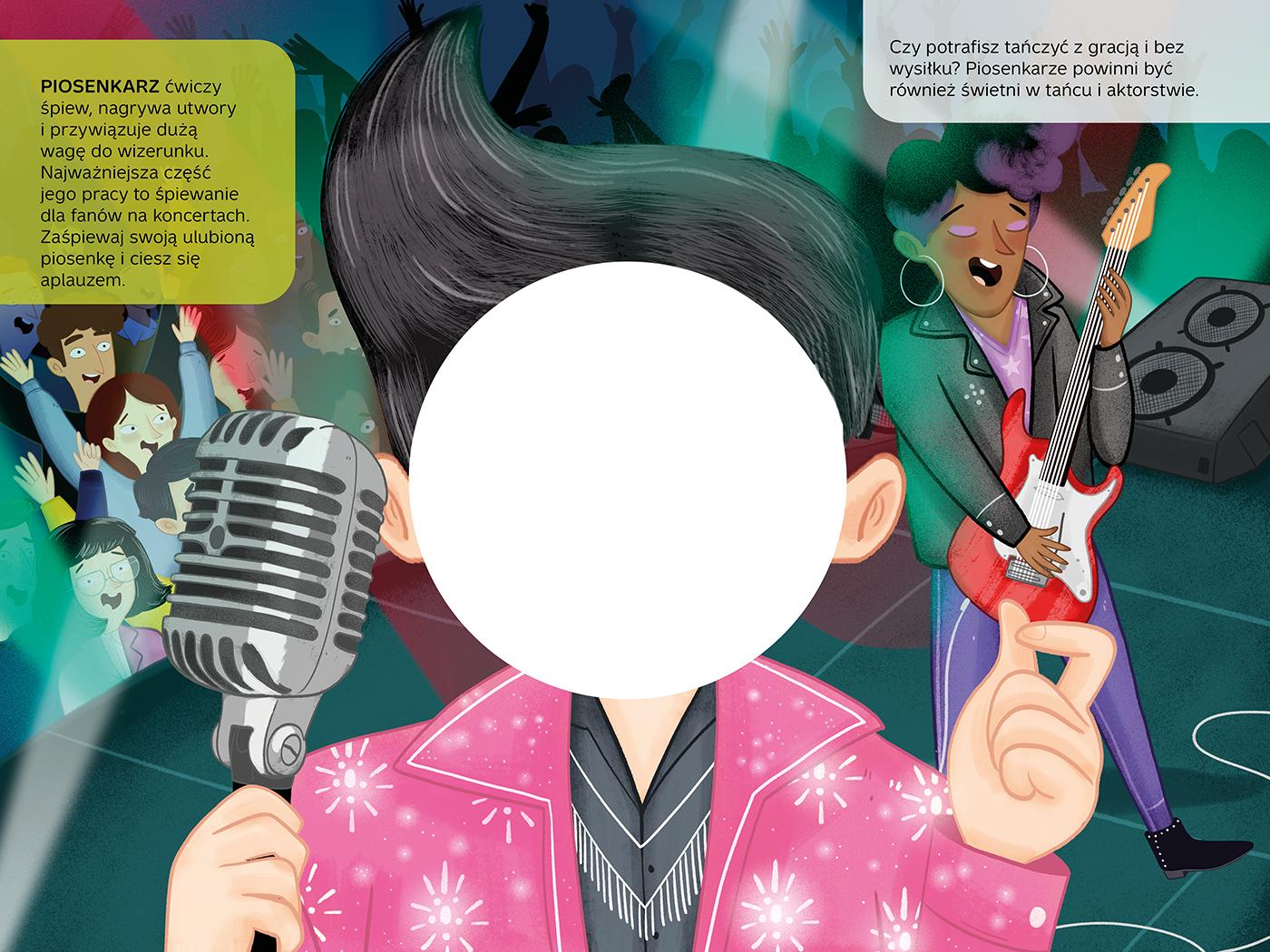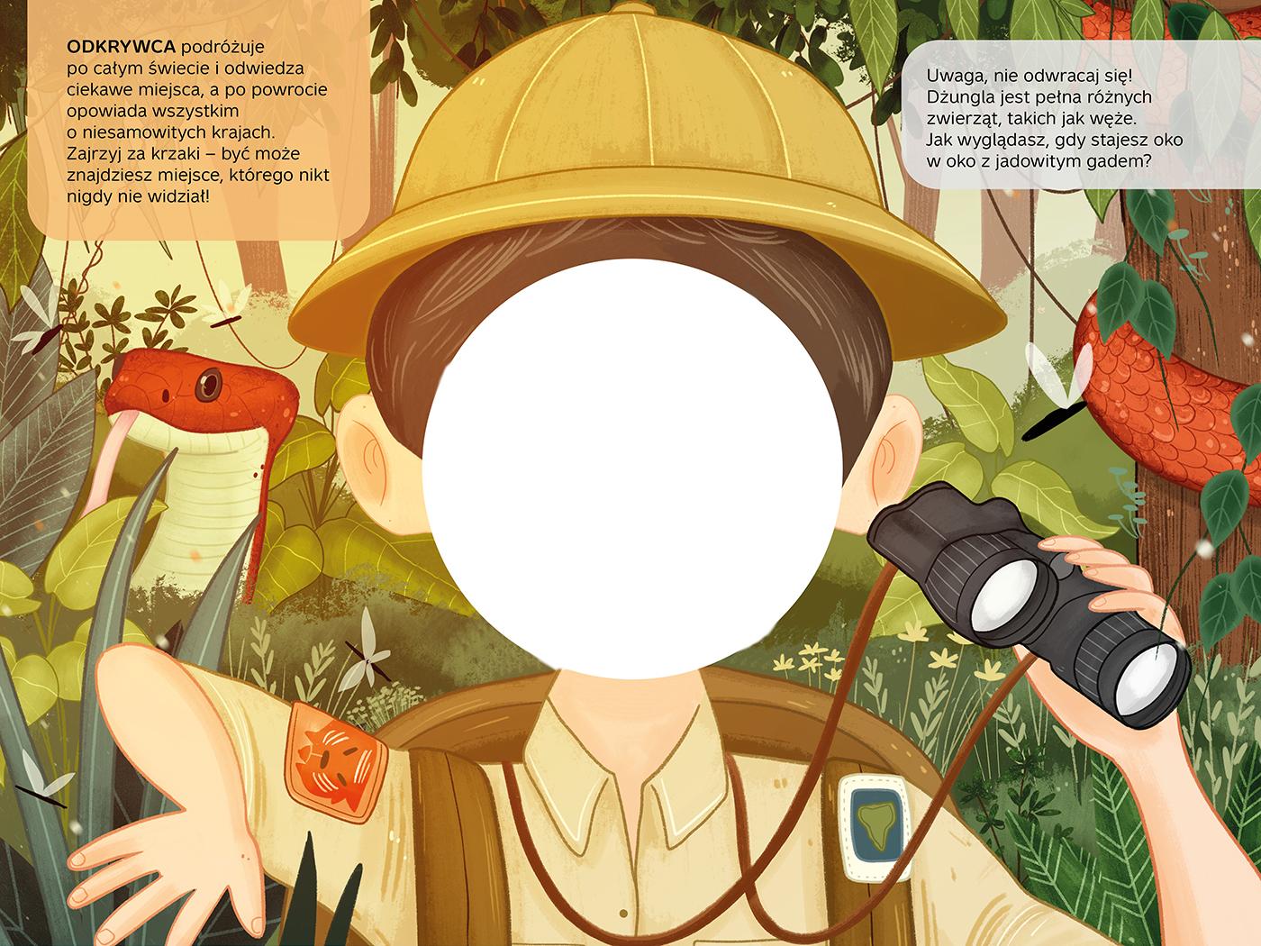 Zostań na chwilę piosenkarką albo kosmonautą! Dzieci często wyobrażają sobie, jak by to było być piosenkarką, pielęgniarką albo policjantem. Naprawdę łatwo się tego dowiedzieć! Wystarczy, że mały czytelnik podejdzie do lustra, przyłoży tę książkę do twarzy i puści wodze fantazji. I koniecznie powinien zrobić sobie zdjęcie w policyjnym mundurze albo skafandrze kosmonauty! Książka ma wycięty kształt, który idealnie pasuje do dziecięcej buzi. Dzięki niemu dziecko łatwo wcieli się w kolejne postaci i będzie świetnie się bawić! A przy okazji pozna tajniki pracy w różnych zawodach.Szczegółowe informacje na temat książki Załóż czapkę policjanta Wypróbuj 7 zawodów