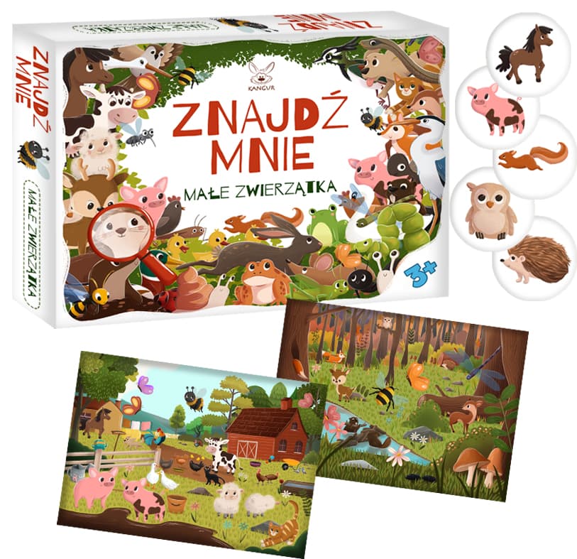Gdzie stoi konik? Gdzie schowała się kurka? Czy widzisz kotka? Na kolorowych planszach ukryły się małe zwierzątka. Mali gracze odnajdują zwierzątka i dopasowują do nich żetony. Gra rozwija u dzieci wyobraźnię i koncentrację. Bawcie się dobrze!