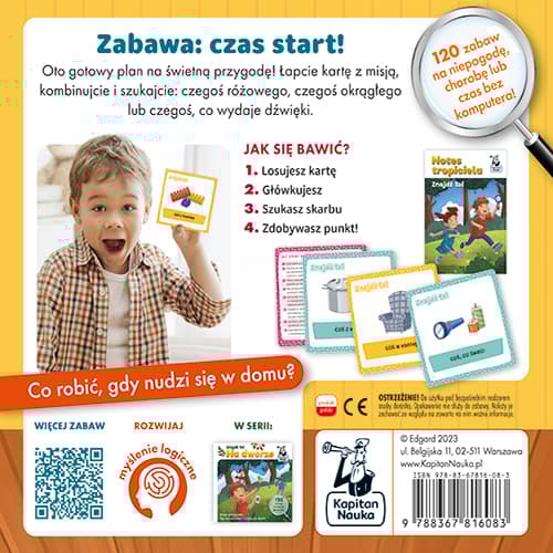 Znajdź to! W domu to zestaw 120 zabaw, które idealnie wypełnią wolny czas, gdy nie można wyjść na dwór – w czasie niepogody, choroby lub długich zimowych wieczorów. Sprawdzą się również w codziennej zabawie, na urodzinowym przyjęciu czy w czasie odwiedzin przyjaciół lub rodziny. Dzięki nim dzieci spędzą wartościowy czas bez ekranów, a przy okazji rozwiną kreatywność i myślenie logiczne. W zestawie znajduje się 60 misji, czyli haseł z obrazkami do poszukiwania skarbów, oraz 60 wyzwań, które można realizować w pojedynkę lub zespołowo. Hasła na żółtej stronie kart są łatwiejsze, a na turkusowej – nieco trudniejsze, dzięki temu szanse na jak najszybsze znalezienie skarbów mają zarówno maluchy, jak i starszaki. Wyzwania zostały podzielone tak, aby rozwijać zainteresowania i mocne strony dzieci. Są więc zadania dla konstruktorów, artystów, sportowców i uwielbiających wymyślać historie. Przy każdym z czterech typów wyzwań umieszczono informacje, które pomysły wymagają brudzenia rąk, a które użycia tylko wyobraźni i wskazywania elementów. Uczestnicy zabawy będą szukać czegoś różowego, czegoś okrągłego lub czegoś, co wydaje dźwięki, zbudują dla siebie kryjówkę lub fort, stworzą obraz z odcisków dłoni pomalowanych farbą, wymyślą muzyczną zagadkę, nucąc tylko dźwięki, sprawdzą, w ilu krokach o długości stopy mogą dojść z łazienki do kuchni, oraz przeturlają się niczym kłoda drzewa na drugi koniec swojego pokoju. Znajdź to! W domu to świetny sposób na angażującą rozrywkę, która odciągnie dzieci od ekranów, a rodzicom da chwilę odpoczynku, a także pozwoli spędzić wartościowy czas z całą rodziną! Rozwój myślenie logiczne, kreatywność, wyobraźnia W serii również • Znajdź to! Na dworze (4–8 lat)